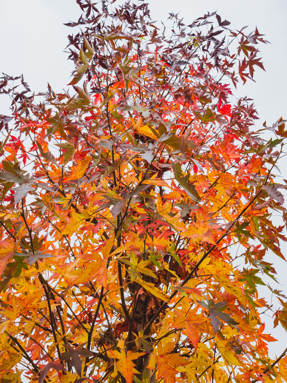The leaves of Liquidambar styraciflua 'Worplesdon' turn yellow, orange, red in autumn.