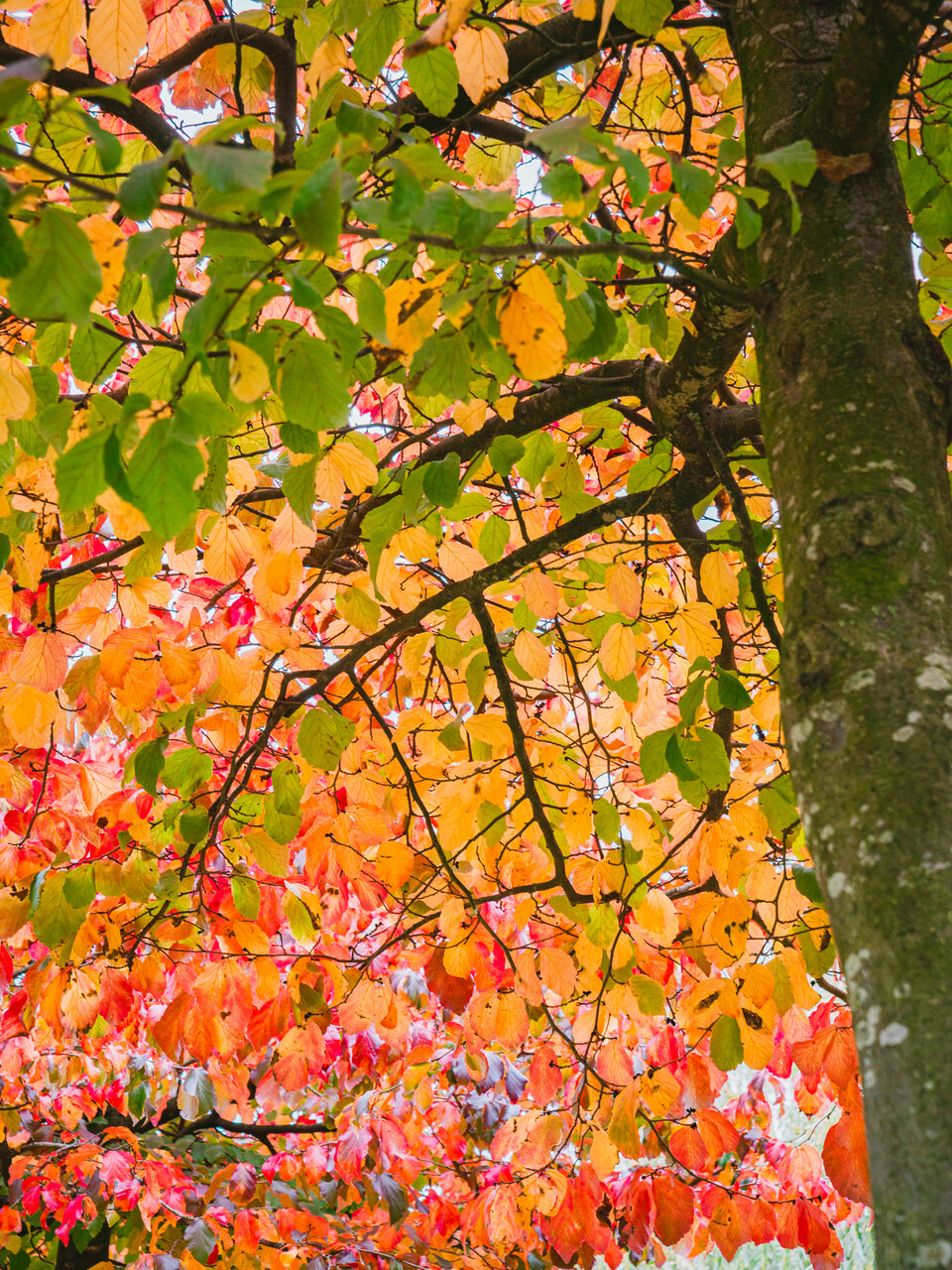 The leaves of Parrotia persica turn yellow, orange, red, purple in autumn.