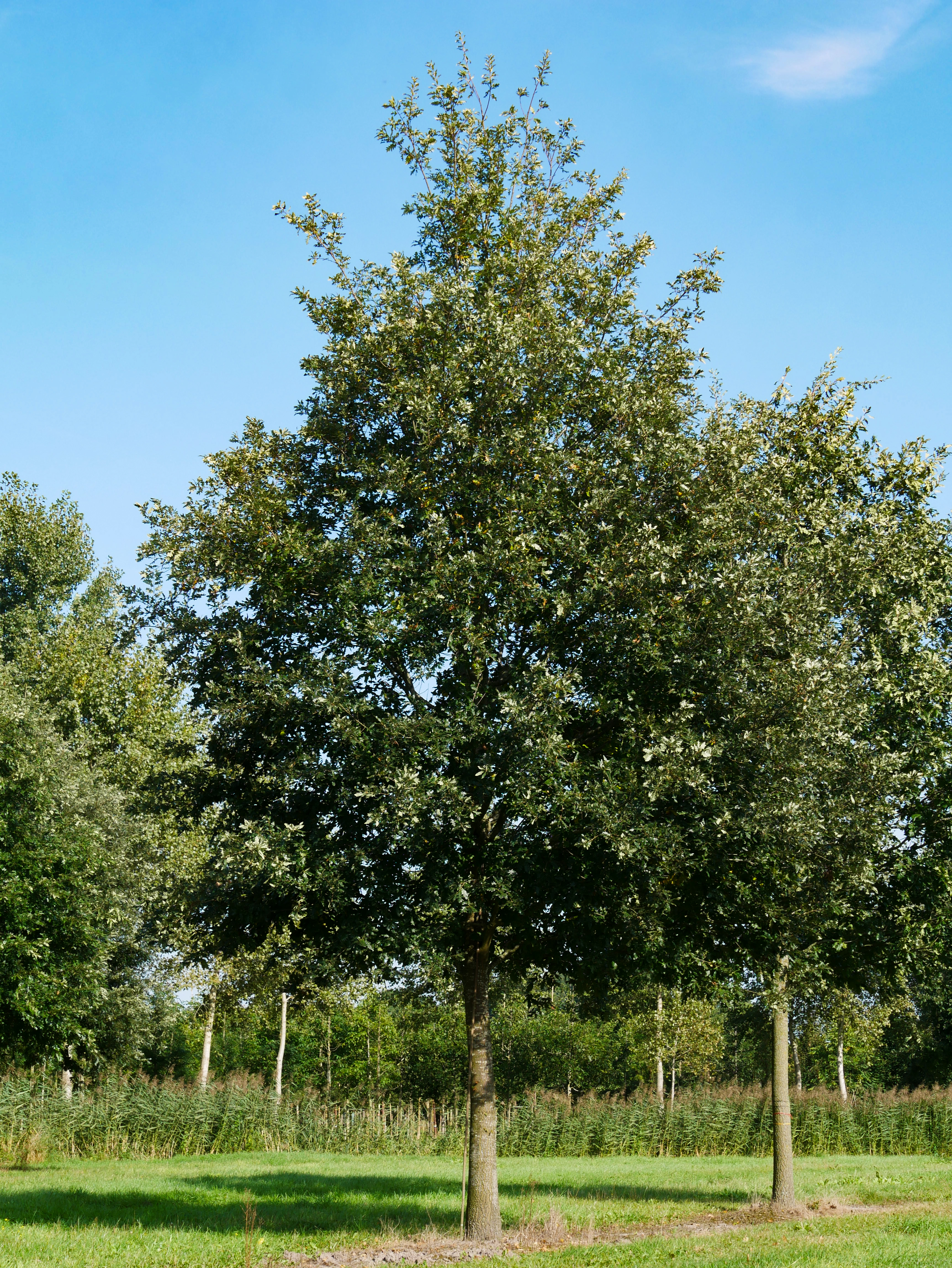 A sturdy tree with a broad, spherical, later rounded crown usually with an ascending main trunk with heavy crown branches. The trunk is roughly grooved with long bark plates. Young twigs are greyish and felt-like, angular at the top. The buds have downy hairs and moss-like stipules. The dark green leathery leaves vary in shape, usually elongated to oval. They are rough on the upper side, bare on the underside, and have 4 to 9 pairs of shallow to very deep lobes. The autumn colour is yellowish-brown. The leaves remain on the tree until deep into the winter. The acorns are half enclosed in the cupule that is thickly covered with narrow scales: these are turned backwards at the top and have thick grey hairs. The tree is an important producer of timber. It is sensitive to cracks caused by frost but insensitive to mildew.