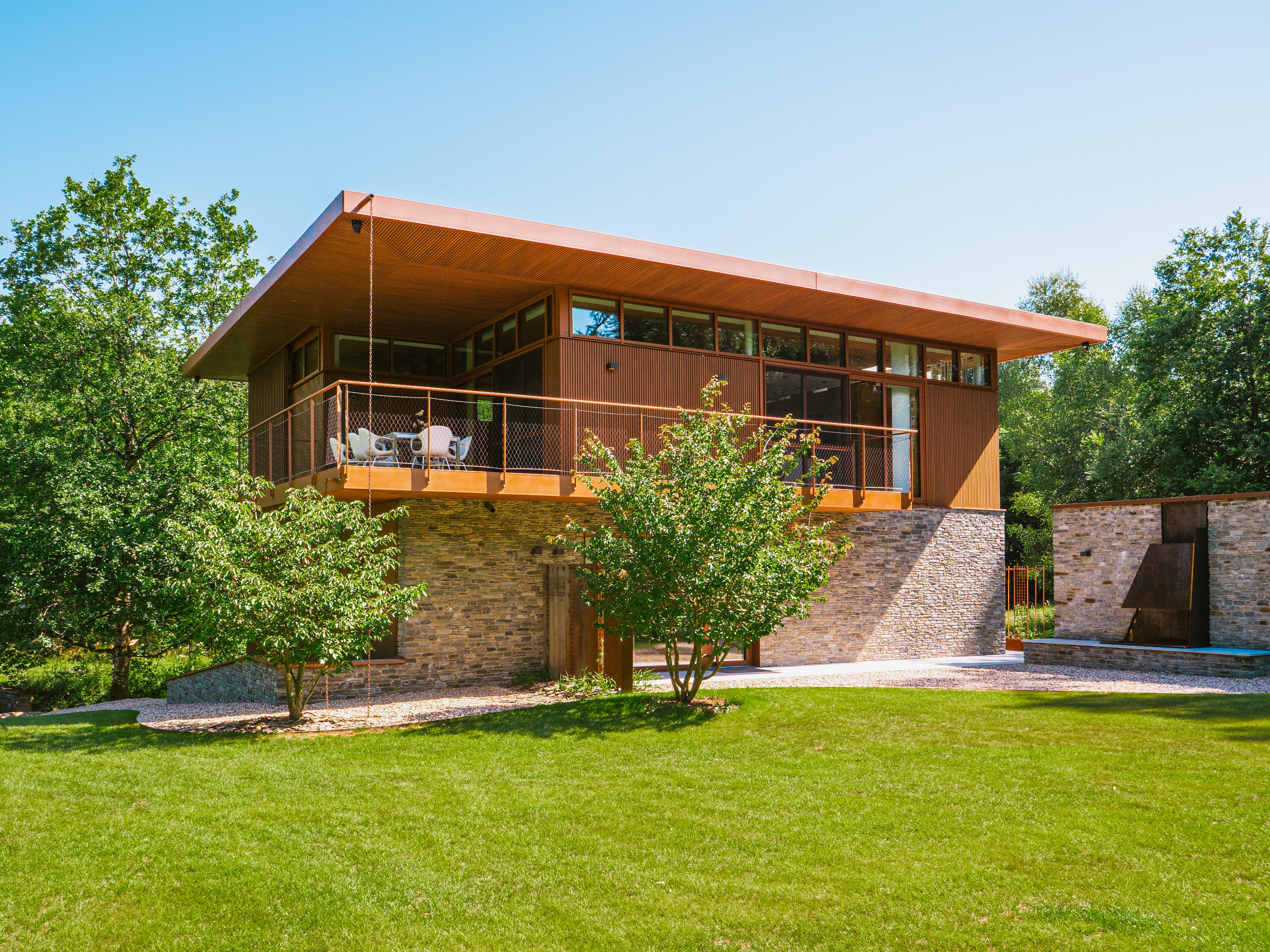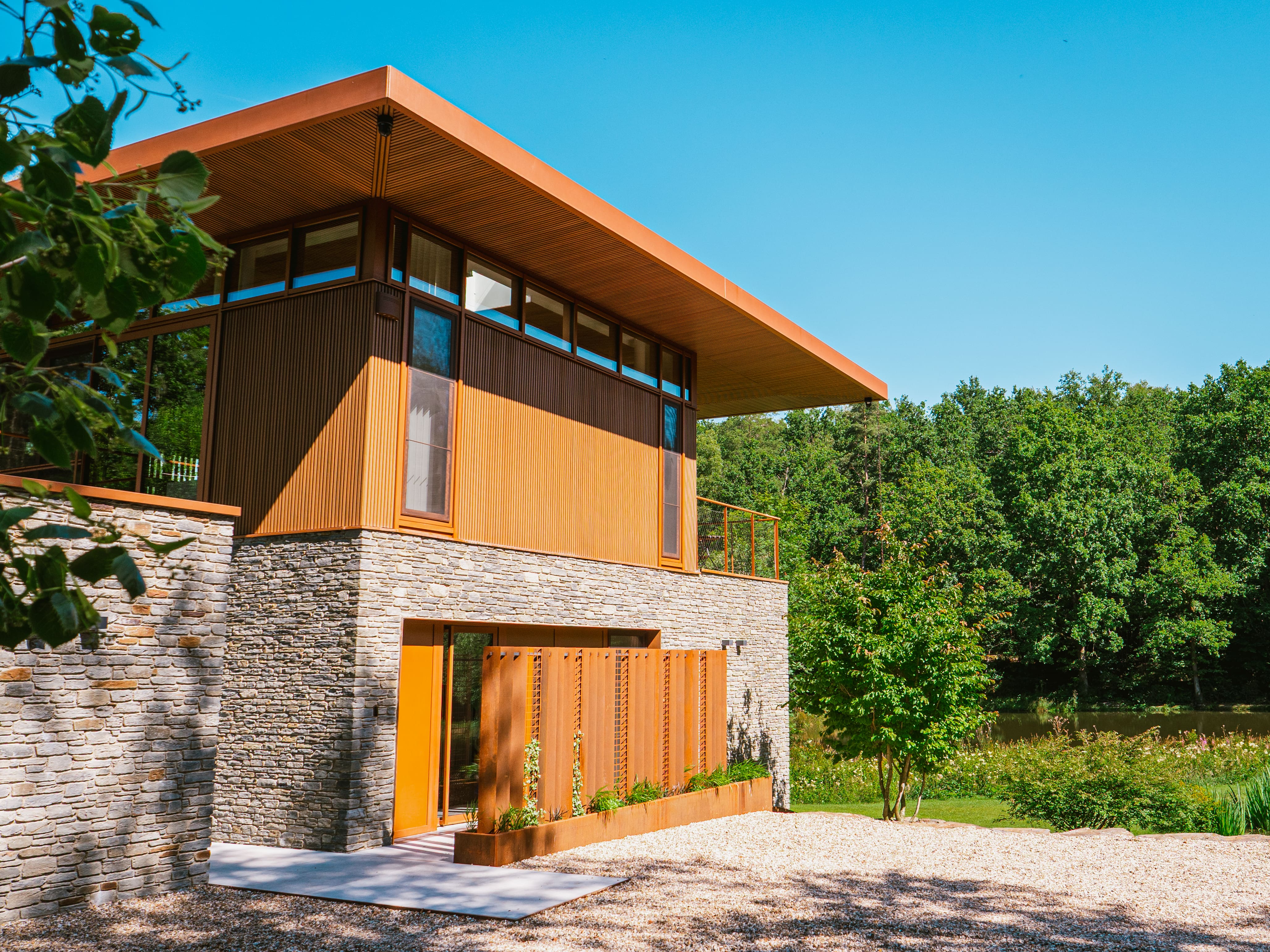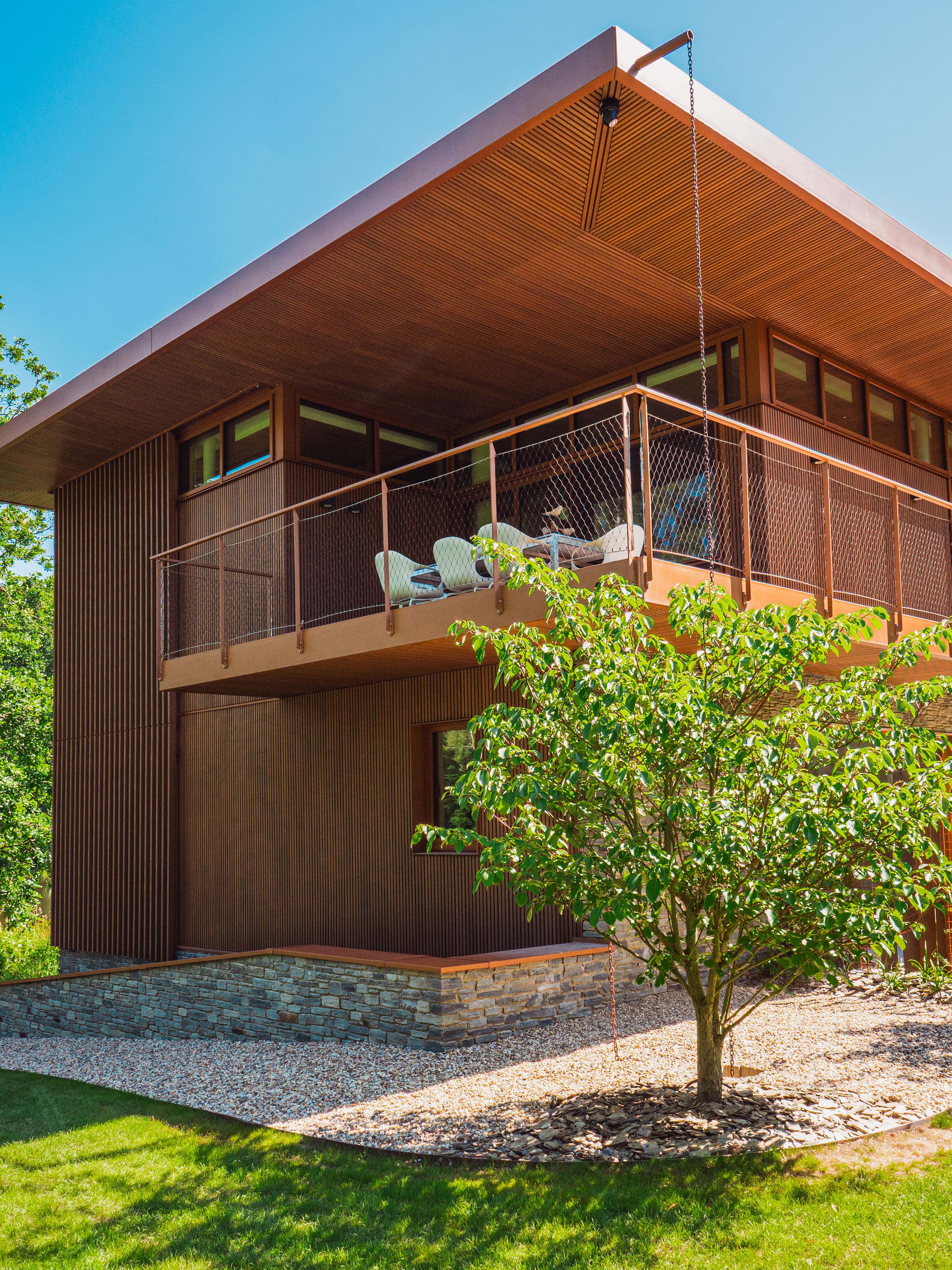 Around the modern house, designed in a charming retro style, numerous trees have been planted. These green plantings ensure that the garden seamlessly transitions into the surrounding landscape, offering a different atmospheric setting each season. The whole forms a stunning picture that the residents will enjoy for many years to come.