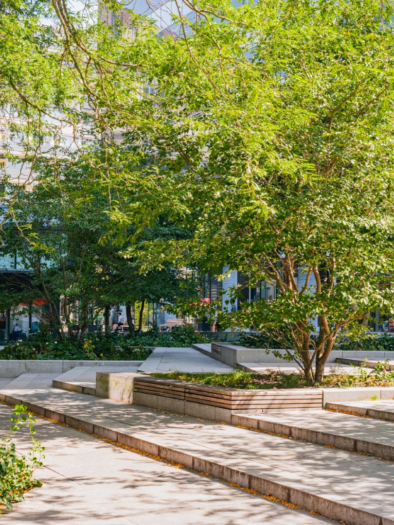 At other locations in the city centre, additional species have been used, such as Tilia, Sorbus 'Dodong', Cornus mas, Robinia and Acer saccharinum. The mix creates varied urban greenery that will remain climate-resilient in the long term and helps reduce heat stress and improve water infiltration.