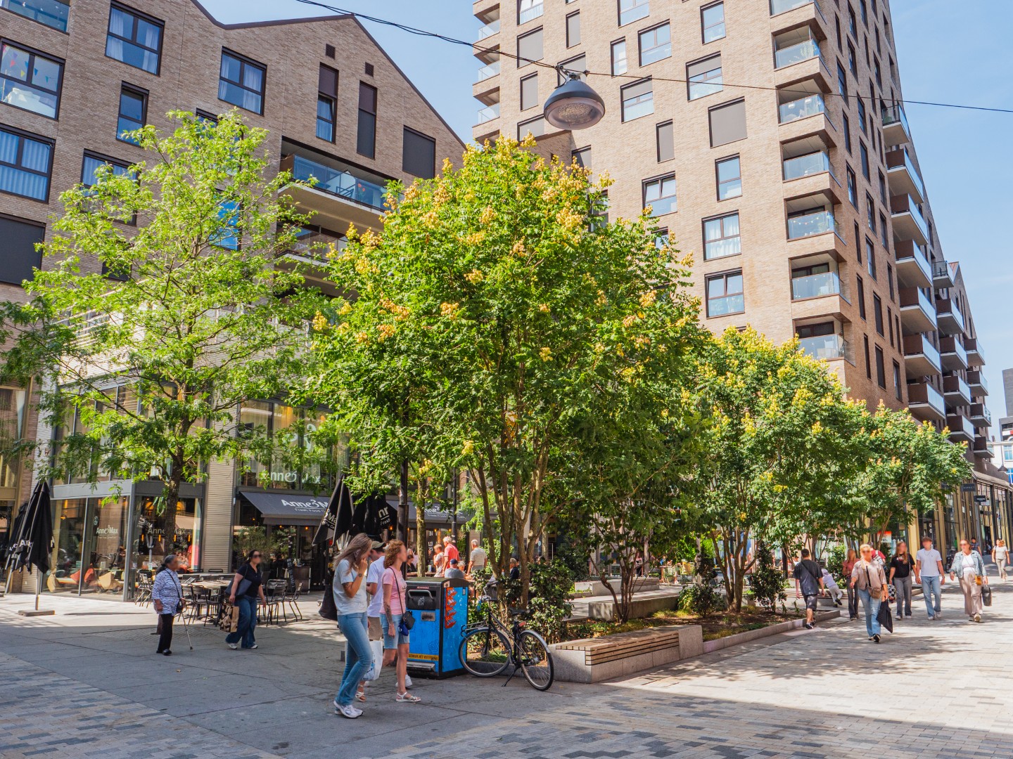 At Willemsplein, the planting includes Pinus sylvestris, Zelkova serrata 'Green Vase', Styphnolobium japonicum 'Regent' and Quercus robur. These species were chosen for their heat tolerance and their ability to perform well in an intensively used city centre with extensive paving.