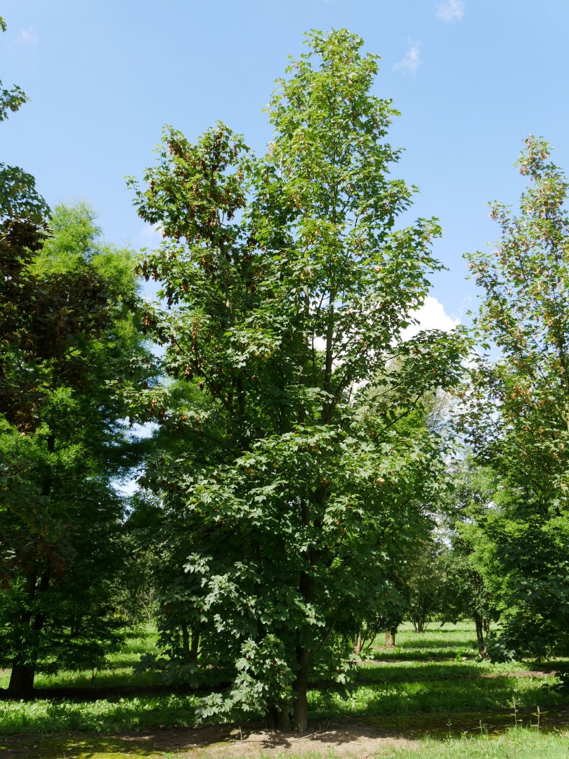 Imposing tree with a thick, undulating crown. Crown shapes can vary with seedlings. Mature trees can reach a height of 40 m and can become 500 years of age. It has green leaf buds which is strikingly different from A. platanoides which has red leaf buds. The decorative grey trunk flakes off in small pieces. The leaf stalk does not contain milky sap, an important difference with A. platanoides. The leaf is green on top, the underside is grey pilose. Autumn colour is golden yellow, but not as beautiful as A. platanoides. The wings of the nutlets are in a right to acute angle in relation to each other. Those of A. platanoides are in a wide angle. Deep rooting. Tolerant to wet and cold soils, can not stand in water for a long time. Suitable for industrial estates and coastal areas. Slightly sensitive to salt for icy roads.