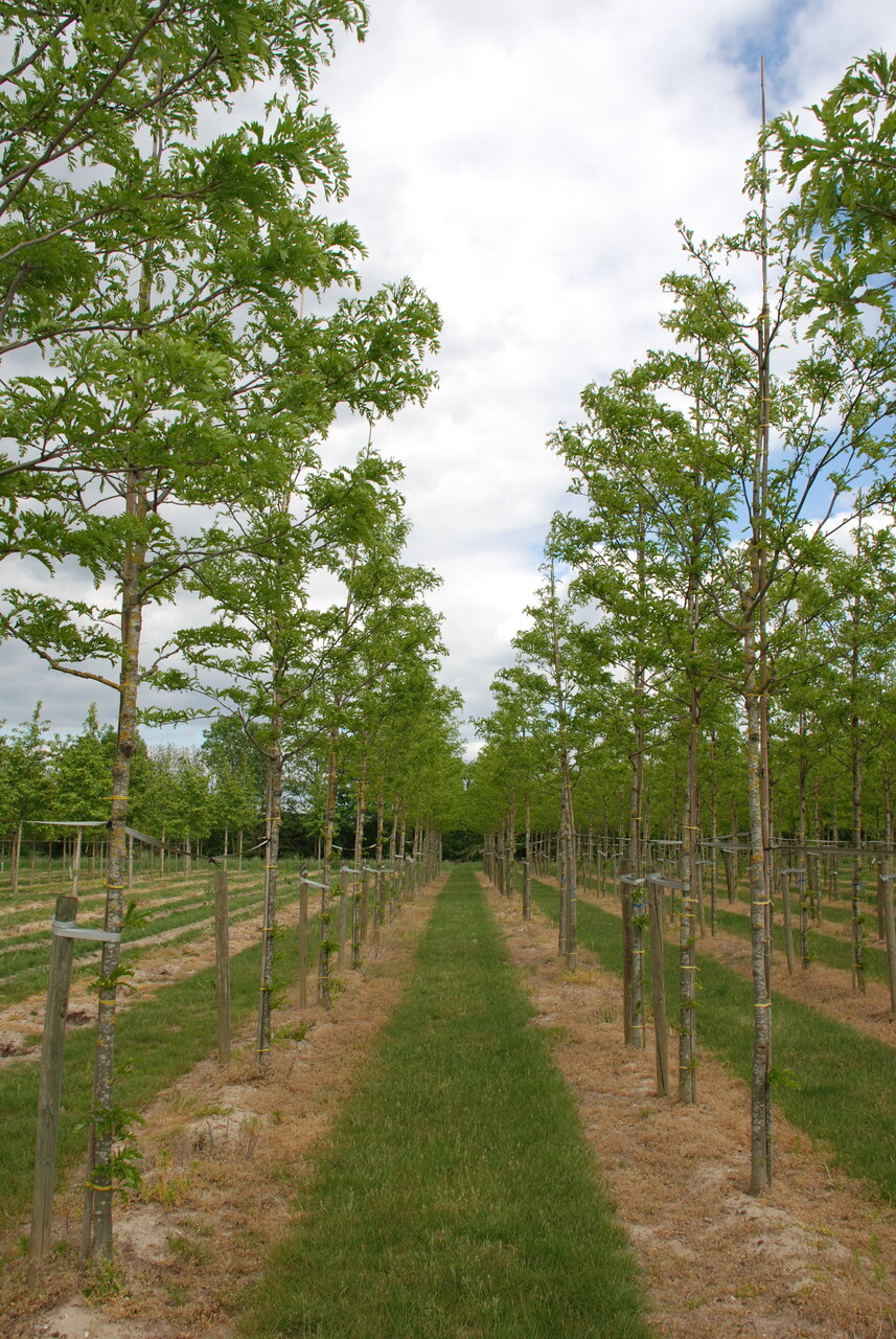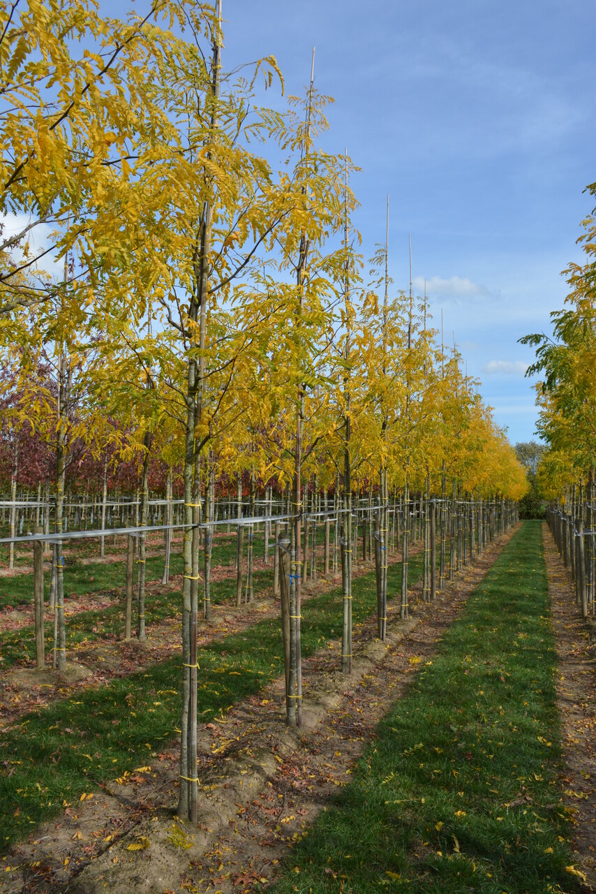 Medium-size tree with a narrow pyramidal crown, up to approx. 13 m. Because the trunk grows a straight central leader with little forking, it forms a regular crown. The thornless twigs are olive green, while the older bark is smooth and grey-brown. Grows thicker than other Gleditsia cultivars. The compound leaf emerges late. It is glossy dark green, turning golden yellow in autumn. Does not blossom very profusely, so produces hardly any fruit. Easier to cultivate in comparison to other Gleditsias. Very good street and avenue tree: can grow amid paved surfaces. Also suitable for industrial areas.