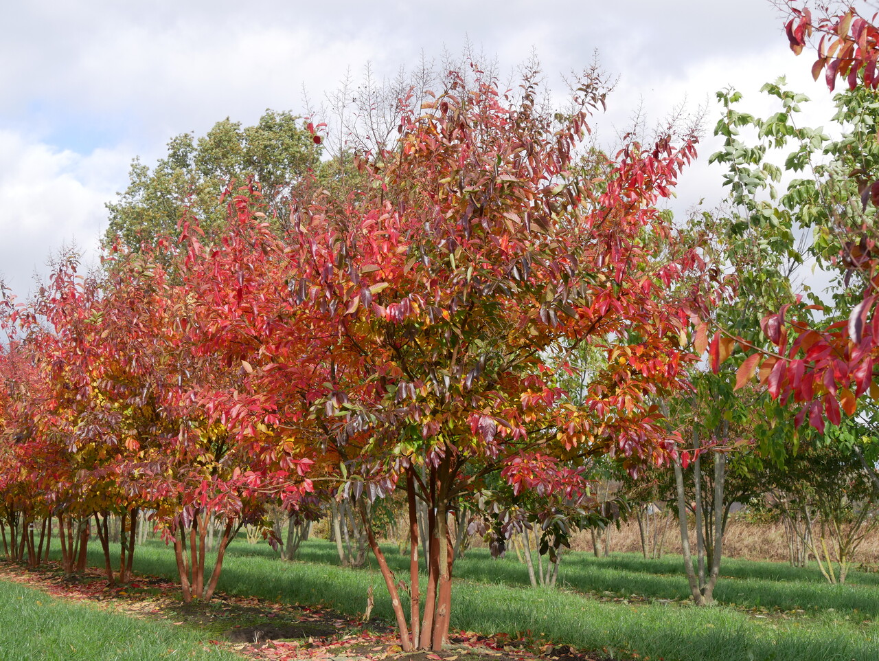The leaves of Lagerstroemia 'Natchez' turn yellow, orange, red in autumn.