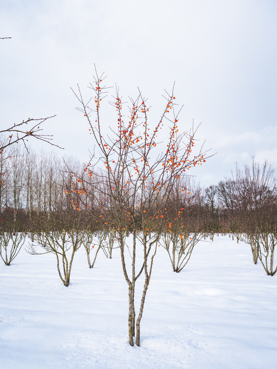 Small tree with a pyramidal crown that later broadens out. The branches spread wide, becoming somewhat pendulous later. The twigs and bark are hairless and dark brown. The slightly lobed and dark green leaves remain in the tree for a long time in the autumn, turning to yellowish-orange. The flowers, almost 6 cm in size, grow in bundles of 4 to 8 together. In the bud the flowers are dark purplish-pink but they turn bright white when open. 'Evereste' produces abundant orange-red to red fruits with a diameter of up to 2.5 cm that remain hanging in the tree until far into the winter. Can be used in gardens, parks and public gardens, but only in verges as a street tree. The tree grows best in nutritious, not too dry soil. Free of mildew and scab. Allowing a solitary planted shrub to grow into a multi-trunked tree can produce an attractive effect.