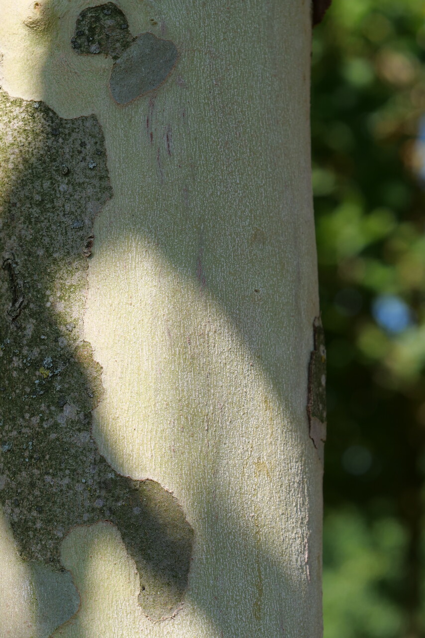 'Woodside Column' is a large tree to about 20-25 m tall. The crown is long columnar, but will widen in later life, becoming more or less narrowly oval. The twigs and bark have the same distinctive colours as P. ×hispanica. The grey-green and yellow-green exfoliating bark is therefore an attractive added ornamental feature in 'Woodside Column' too. At 12-25 cm, the hand-lobed leaves are the same size as in P. ×hispanica. However, the leaves are darker green, giving the tree a healthy appearance. They turn brownish-yellow in autumn.