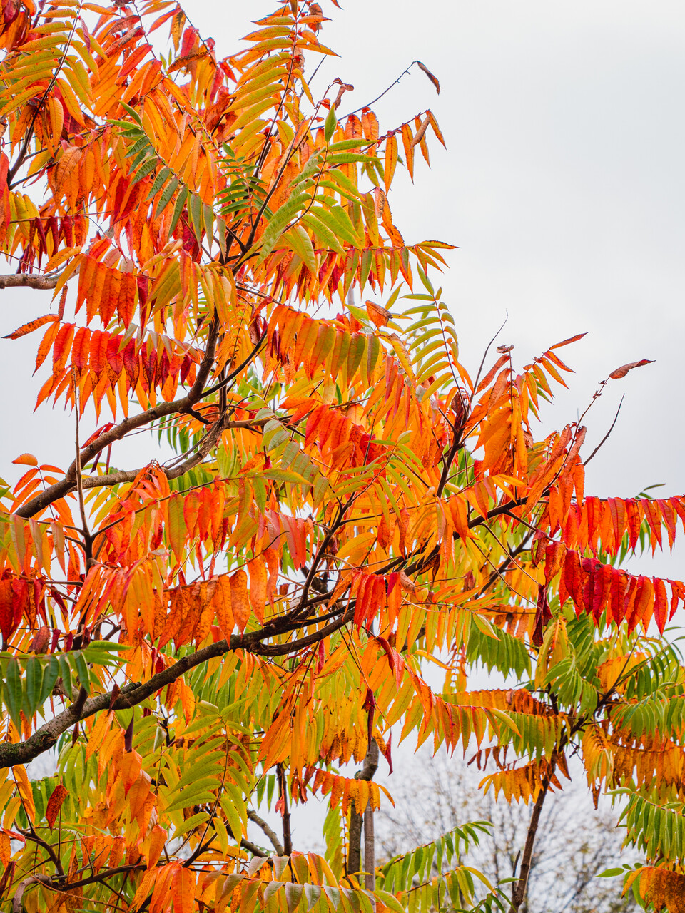 The leaves of Rhus typhina turn yellow, orange, red in autumn.
