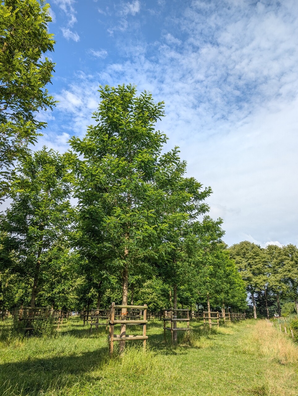 Robinia pseudoacacia 'Nyirsegi' is a Hungarian-origin selection that grows quickly and has a straight trunk with strongly ascending branches. Specially selected for its strong fibre, therefore used for hand tools. Height 20 - 25 m. Because of its vigorous growth, it is often used as a rootstock for 'Umbraculifera'. Characteristic are the large thorns on the branches. The compound leaves are dark blue-green. Short clusters of creamy-white flowers appear in June but the flowering time is shorter than for the species. Produces few legumes. Less wind sensitive than other cultivars. Hardiness zone: 5a